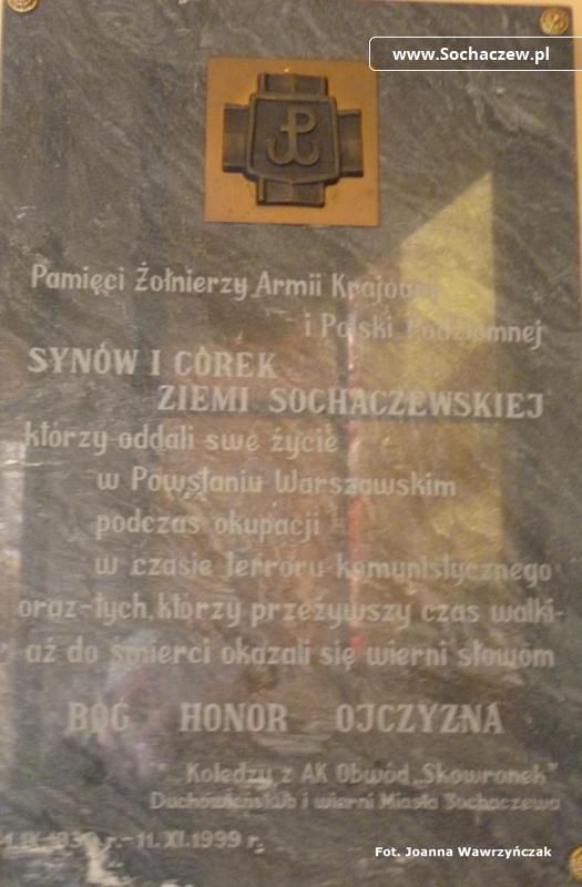 Tablica znajduje się wewnątrz kościoła pw. Matki Bożej Różańcowej w parafii św. Wawrzyńca. Została wmurowana 11 listopada 1999 roku dzięki staraniom wspólnoty parafialnej i sochaczewskich żołnierzy AK. Na jej powierzchni widnieje napis :
