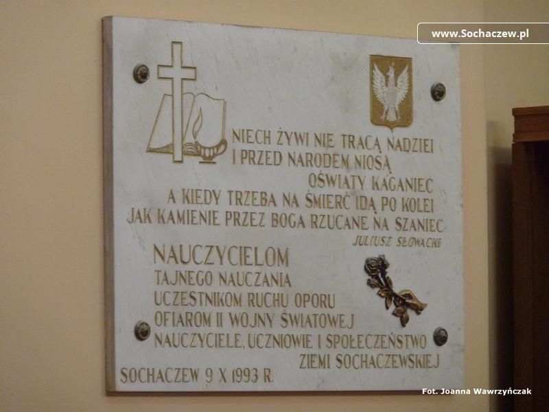 Tablica wmurowana wewnątrz świątyni i poświęcona przez bp Alojzego Orszulika 9 października 1993 roku w celu uczczenia pamięci nauczycieli tajnego nauczania, uczestników ruchu oporu i ofiar II wojny światowej. Pomysłodawcami powstania tablicy są nauczyciele, uczniowie i społeczeństwo Ziemi Sochaczewskiej. Znajduje się na niej cytat Juliusza Słowackiego :