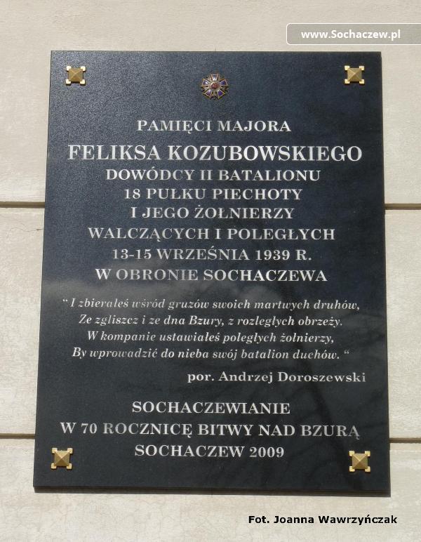 - Tablica pamięci majora Feliksa Kozubowskiego dowódcy II Batalionu 18 pułku piechoty i jego żołnierzy walczących i poległych w dniach 13-15 września 1939 roku w obronie Sochaczewa. Wmurowana w 2009 roku w 70 rocznicę Bitwy nad Bzurą dzięki inicjatywie mieszkańców Sochaczewa.