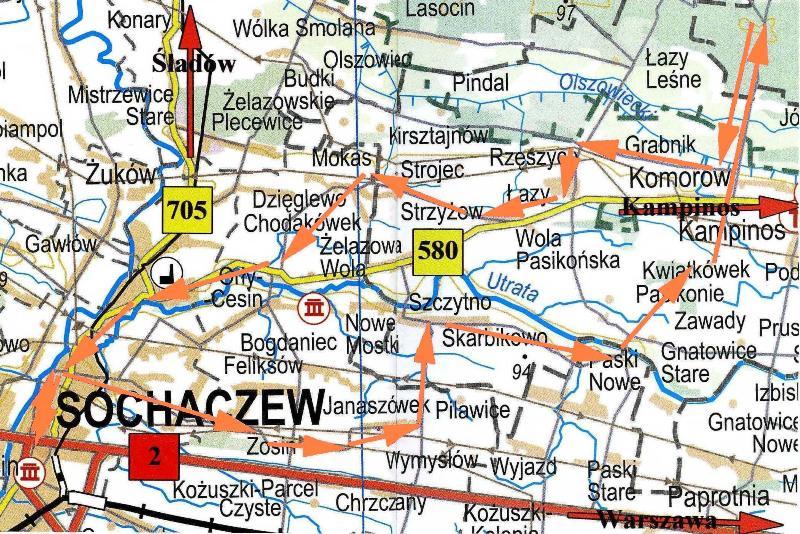 Jana Pawła II, na którym znajduje się pomnik upamiętniający Ojca Świętego Jana Pawła II i Prymasa Stefana Wyszyńskiego. Z pl. Kościuszki jedziemy w lewo ul. Staszica do skrzyżowania ze światłami z Al. 600-lecia i Trojanowską. Za skrzyżowaniem (światła) jedziemy ul. Trojanowską, po drodze przejeżdżamy tory kolei wąskotorowej, mijamy po lewej stronie cmentarz komunalny i docieramy do skrzyżowania z drogą prowadzącą od trasy poznańskiej do Żelazowej Woli. Przez skrzyżowanie przejeżdżamy prosto, by w miejscowości Kożuszki Parcel przed firmą MARS Polska skręcić w lewo i przez Janaszówek (8,2 km) dotrzeć do skrzyżowania we wsi Wyjazd. Stąd w lewo wygodną drogą do Szczytna (11,8 km). Obok krzyża skręcamy w prawo i przez Skarbikowi, przez most na Utracie (15,9 km) w prawo do Zawad. Za kościołem w Zawadach (16,6 km) skręcamy w lewo i tą drogą dojeżdżamy do skrzyżowania z drogą wojewódzką nr 580 (19,6 km). Przekraczamy ją jadąc prosto i dojeżdżamy do znajdującego się w Puszczy Kampinoskiej, leśnego parkingu w Granicy (22,8 km). Wracamy tą samą drogą, lecz nie dojeżdżamy do drogi wojewódzkiej nr 580, gdyż przed wzniesieniem skręcamy w prawo w drogę gruntową (24,2 km), którą dojeżdżamy do wsi Grabnik (27,8 km). Na końcu wsi jedziemy w lewo, pod górę do wsi Łazy (28,5 km), tu w prawo do drogi gruntowej obok tartaku wiodącej do wsi Wola Pasikowska (29,6 km). Wjeżdżamy w praw na drogę asfaltową (równoległą do drogi wojewódzkiej) prowadzącą do wsi Strojec (32,6 km)i na rozwidleniu docieramy do wsi Mokas (32,8 km). Dalej droga prowadzi nas do Żelazowej Woli (35,7 km). Z Żelazowej Woli wyjeżdżamy drogą wojewódzką nr 580 ( na wprost od wyjścia z parku) i docieramy do Chodakowa, który jest dzielnicą Sochaczewa.