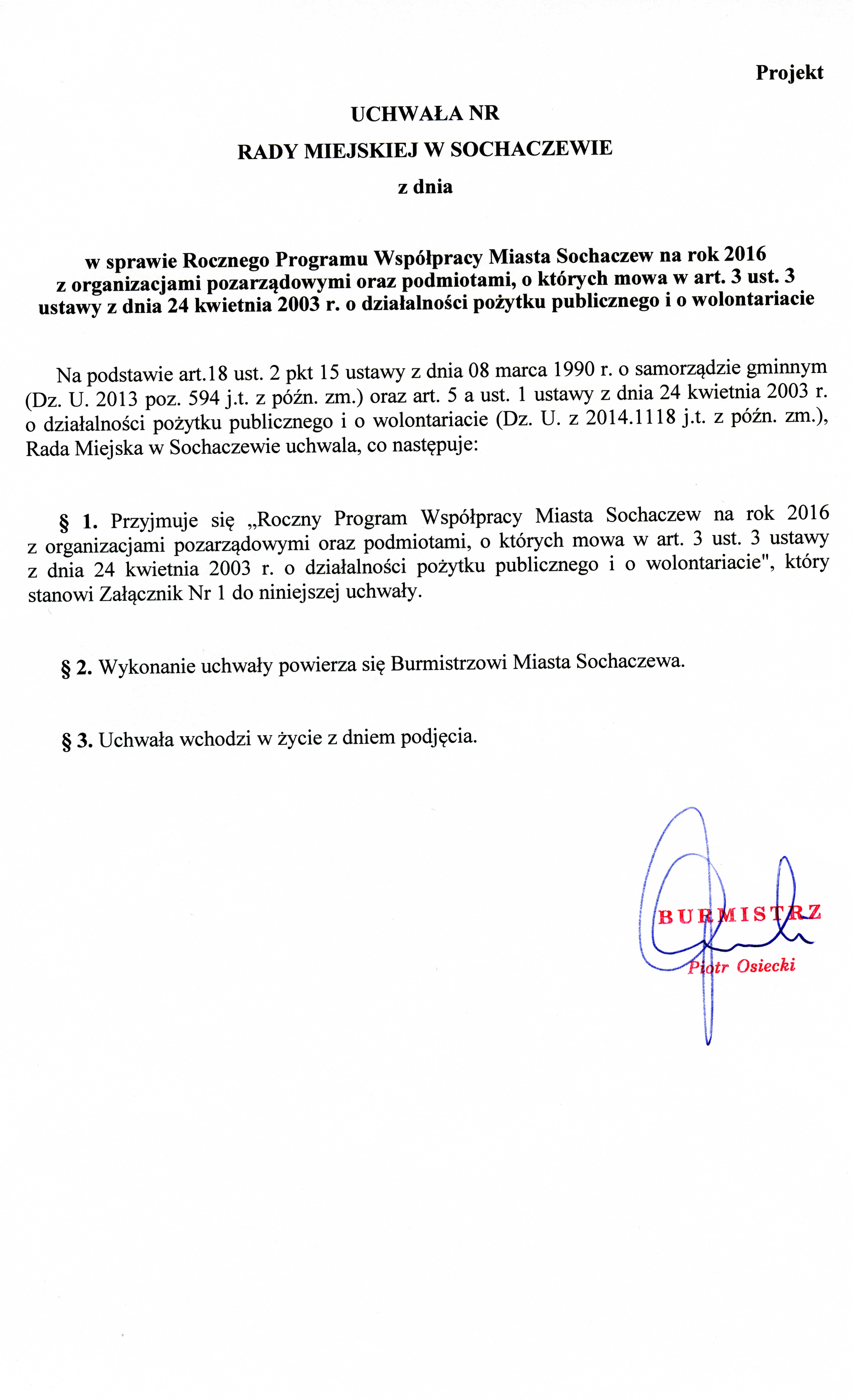 Zapraszamy do składania propozycji do „Rocznego programu współpracy Gminy Miasto Sochaczew na rok 2016 z organizacjami pozarządowymi oraz podmiotami wymienionymi
