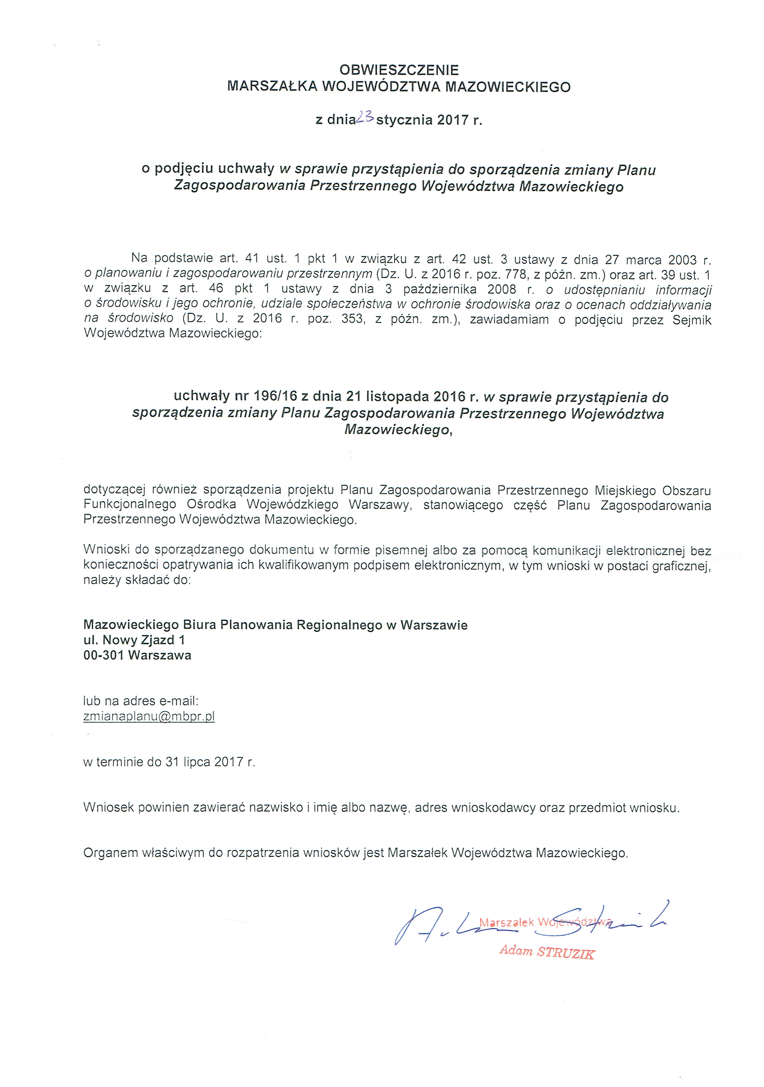 OBWIESZCZENIE MARSZAŁKA WOJEWÓDZTWA MAZOWIECKIEGO z dnia 23 stycznia 2017 r. o podjęciu uchwały w sprawie przystąpienia do sporządzenia zmiany Planu Zagospodarowania Przestrzennego Województwa Mazowieckiego